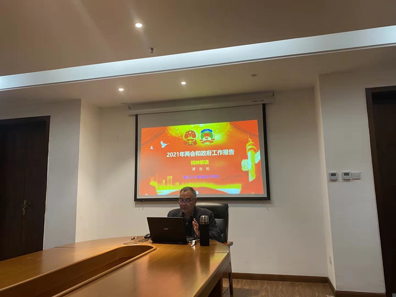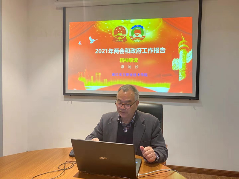 为深入学习2021年“两会”与政府工作报告精神,帮助高职大学生全面了解今年国家工作和发展的大政方针,3月17日,我院马克思主义学院在各二级学院的协同组织和密切配合下,开展了2021年春季全校第一轮形势与政策课宣讲。本次理论宣讲由马克思主义学院院长谭劲松教授,以在线专题报告的形式进行。学院2019级、2020级学生近5000名学生,共同听取了谭教授的“2021年两会和政府工作报告解读”专题授课。