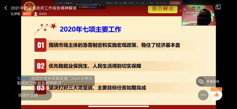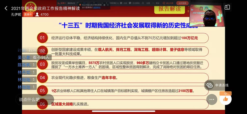 谭教授首先启发学生思考“百姓日常与政治的关系”,从当前国内外社会生活现象对比入手,调动学生学习政治理论的兴趣。授课主题则围绕“2021年政府工作报告”,分三个方面对报告进行了解读:2020年工作回顾,十三五时期发展成就和十四五时期主要目标任务,2021年重点工作。讲授中,谭教授多方联系现实热点话题,层层递进地进行理论分析,引用了大量具体案例、丰富数据,并重点阐释了本年度政府八项重点工作部署,以及两会十大经济民生热点,使大学生对现阶段我国经济社会发展取得的显著成就、对本年度政府工作的周密安排有了深入的了解和认知。谭教授旁征博引、生动亲和的理论讲授,也在线获得了同学们积极共鸣、热情点赞。
