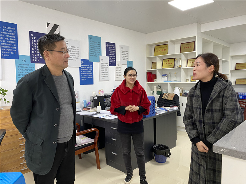 贺文华走访了大学生活动中心、大学生心理健康中心,充分了解中心管理制度、文化建设、工作情况,查看心理健康工作台账,并现场模拟心理咨询。在学生事务服务大厅、大学生征兵工作站(退伍学生事务服务中心),贺文华并就办事大厅业务范围、办理情况、办理人员能力素养和春季应征入伍等工作情况进行了解,他还查看了在校退役学生“一人一档”基本信息档案和国防教育兵器库。在学生公寓,贺文华考察了文明寝室文化布置,考察了朋辈心理工作室、周末厨房等功能房建设,检查了垃圾分类、消防设备、防火防盗等工作情况,听取了禁毒宣传实践基地的初步建设方案。