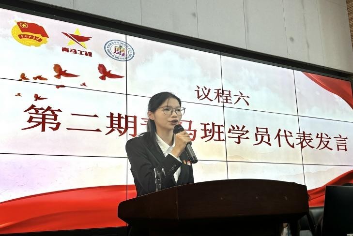 会上,周宁宁老师宣读了第二期青马工程培训安排,具体涵盖培训目标、课程体系及培养方向等,旨在助力青年学子成长为新时代马克思主义的坚定践行者。我院第二期青马班学员代表王瑶瑶同学发言,她表达了对青马班学习的热切期待和坚定决心,并将以饱满的热情投入学习,坚定理想信念,努力成长为政治坚定、本领扎实的青年骨干。
