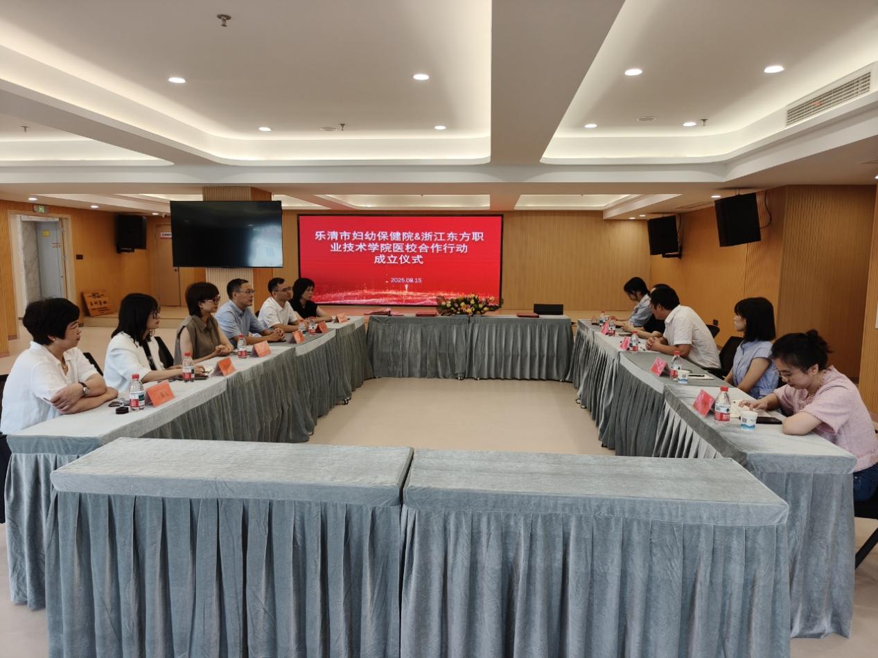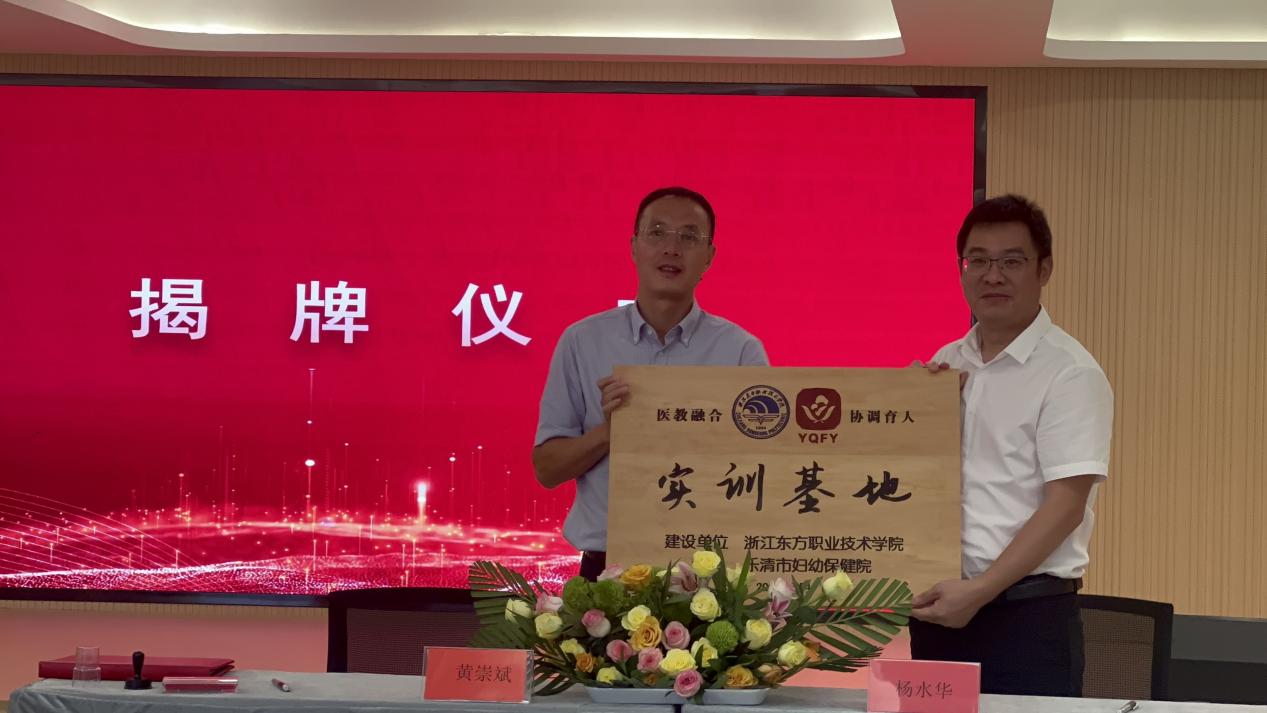 在充分沟通和实地考察的基础上,三方举行了简洁而隆重的签约授牌仪式。浙江东方职业技术学院智慧康养学院分别与乐清市妇幼保健院、乐清萌蒙亮托育中心签署了校企(院)合作协议,并正式授予两家单位“实训基地”牌匾。