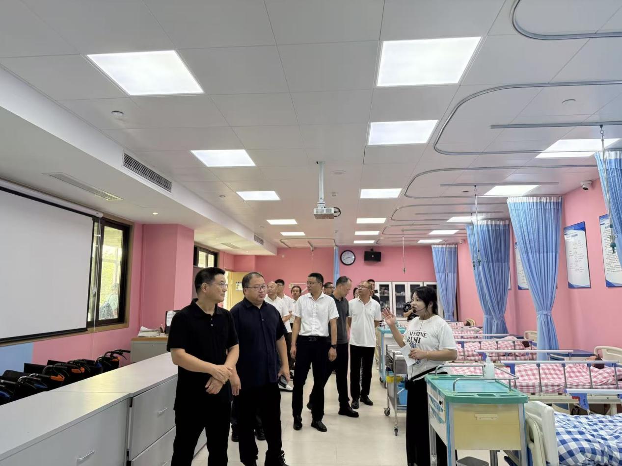 调研组一行实地参观了金竹校区AI智慧康养创新协同中心、颐养中心、颐乐学院、养老公寓样板间、学校实训室等场所,并认真听取园区关于“医康养护教”特色运营模式的详细介绍。