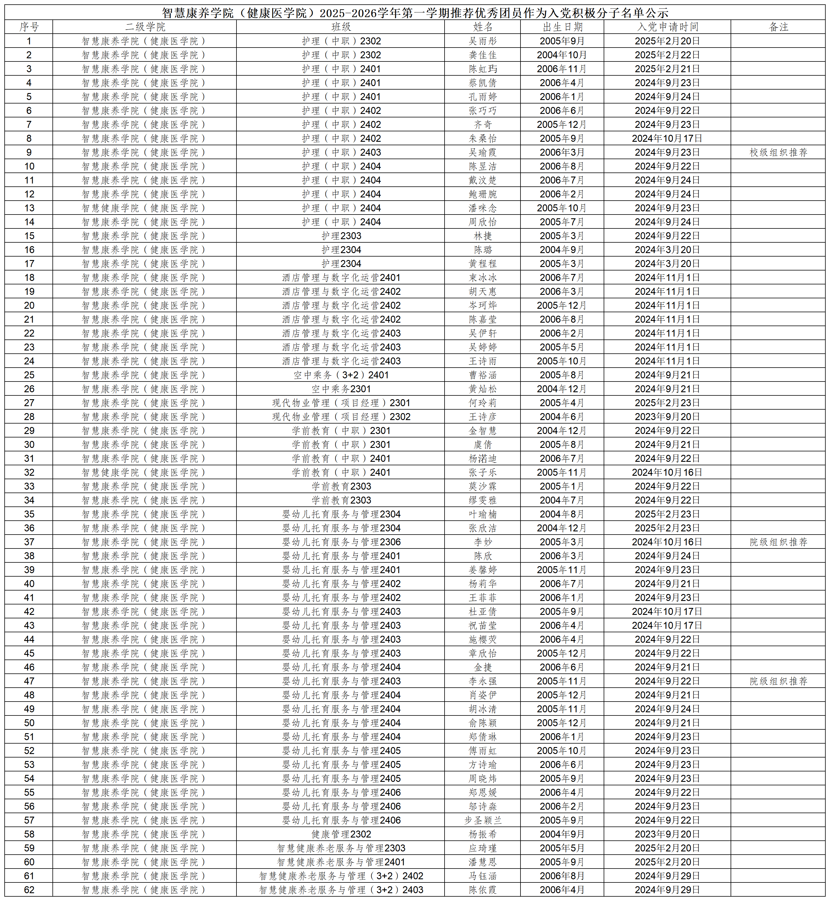 根据浙江东方职业技术学院发展党员工作的相关程序规定,经个人自愿申请、党员积极推荐、群团组织严格推优,智慧康养学院(健康医学院)学生支部支委会经过认真讨论,并报请党委备案获得同意,现拟定吴雨彤等62位入党申请人为智慧康养学院(健康医学院)入党积极分子。现将相关情况予以公示。