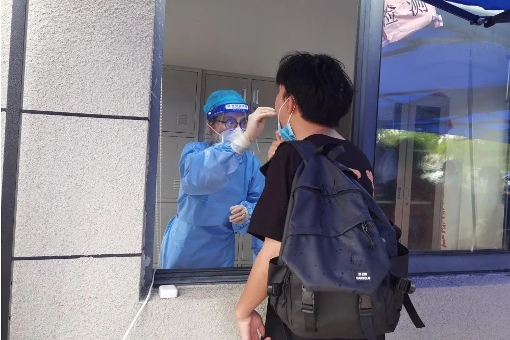 参加核酸采样党员老师在高温环境下,穿着防护服,确保核酸检测工作高标准、高质量、高效率完成,为守护师生的健康安全贡献一份力量。