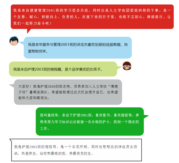 报告,“情暖夕阳”小分队准备完毕,申请出发!我们每个人带着满腔热血,相信在接下来的社会实践中,定能圆满完成任务。更好的锻炼、磨练自己,向先辈看齐,及时勉励,最终获得一个全新的自己。