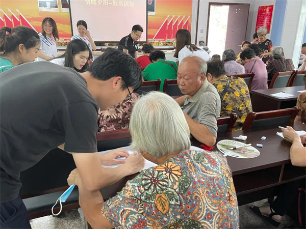 关爱老人既是中华民族传统美德,也是人类进步科学发展的前提,我们都知道关爱老人并不单单是一个家庭、一个孩子的事,而是需要一个社会乃至一个国家的共同努力。今天我们的实践主题是帮助老年人写出自己的名字,虽然大多爷爷奶奶没有上过学,但是对知识的渴望都是有目共睹的,我们在教学过程中虽然语言沟通上有障碍但是我们可以从老人的表情和动作上了解到老人想表达的意思,我们需要倾听老年人的声音,关爱老年人的生活,奉献爱心,肩负起当代大学生的社会责任,为构建和谐社会贡献力量。
