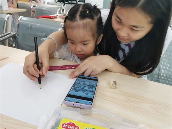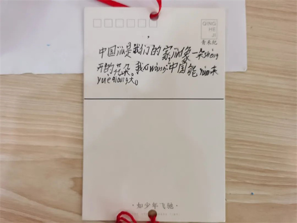 小朋友们仔细思考落笔,虽然笔触稚嫩但却满含真诚,他们用最简单的方式表达着对祖国母亲的爱意,随着一张张明信片的完成,今天的课程也到了尾声,在结束前队员们和小朋友们一起拿着小红旗合影留念。