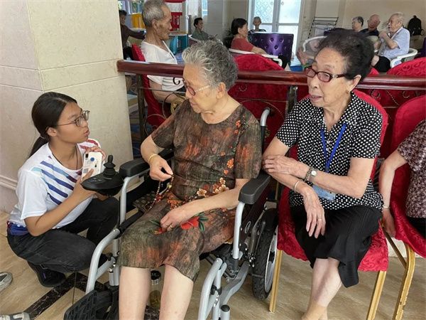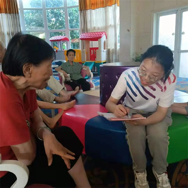 在刚结束不久的“红歌”活动后,一位老爷爷告诉我们唱党歌唱国歌要有感情,要发自内心爱国,把祖国当成自己的母亲。他们非常高兴我们能来看他们,因为我们带来了热情与活力,而青年与老人要互相关爱、互相了解,老一辈都希望下一代能发展得更好,我们要一起为中国加油。