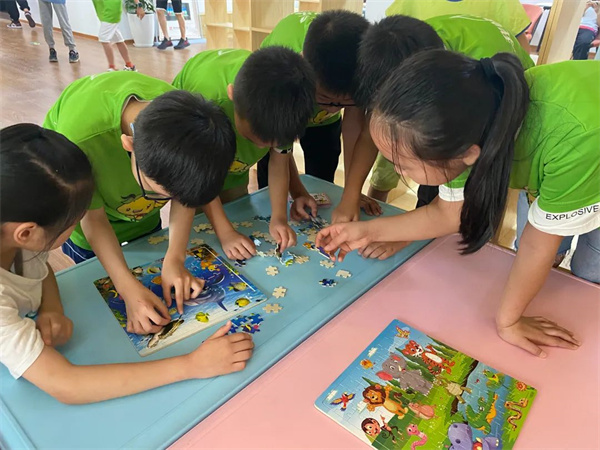 此外,还有套圈、指压板运乒乓、拼图等游戏,一系列游戏让孩子们热情洋溢,心花怒放,这也让“领雁先锋”队友们恍惚间似乎坐着时光机,穿梭到了各自的童年。