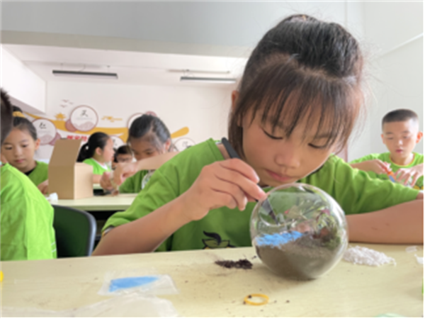 在老师的带领下,大家一步步完成了生态瓶的制作,将泥土放进瓶子底端,挖洞,将植物在土中压实后,铺撒上蓝色的细沙,像是构建出了一层湛蓝的大海,孩子们都认真仔细、小心翼翼地完成,生态瓶中各种各样的装饰品和卡通人物也让孩子们激发出了想象力和创造力,创造出了独一无二的生态瓶,也描绘出了属于他们的独一无二的风景。