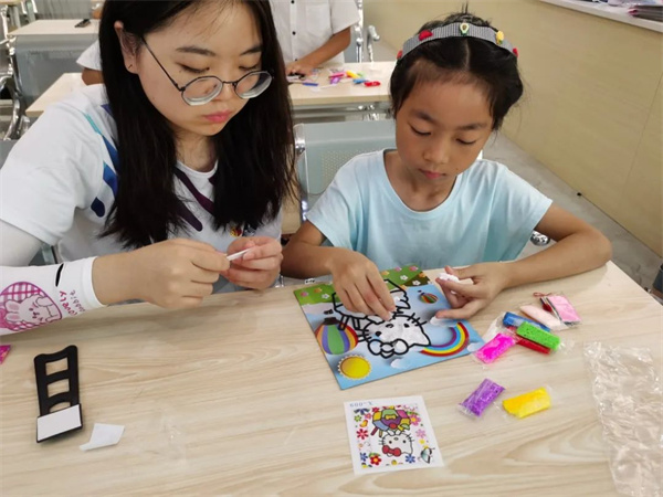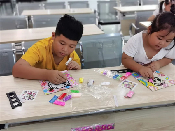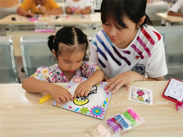 上课过程中,志愿者们主要采用了“老师示范——孩子们模仿——创新发挥”的理念。活动开始前,负责人将活动海报投屏至屏幕上,讲述了此次手工的简单步骤后便开始各自的手工制作,标题中的雪花是指活动中的材料雪花泥,五颜六色的雪花泥在小朋友们稚嫩的手上显得格外新颖,小朋友们挑选自己喜欢的图画,坐在位子上埋头认真填涂手工。孩子们在学习的过程中非常的兴奋而且非常认真,每当遇到不会的步骤时都会向队员们请教学习,并且发挥自己的聪明才智创造出自己的作品。