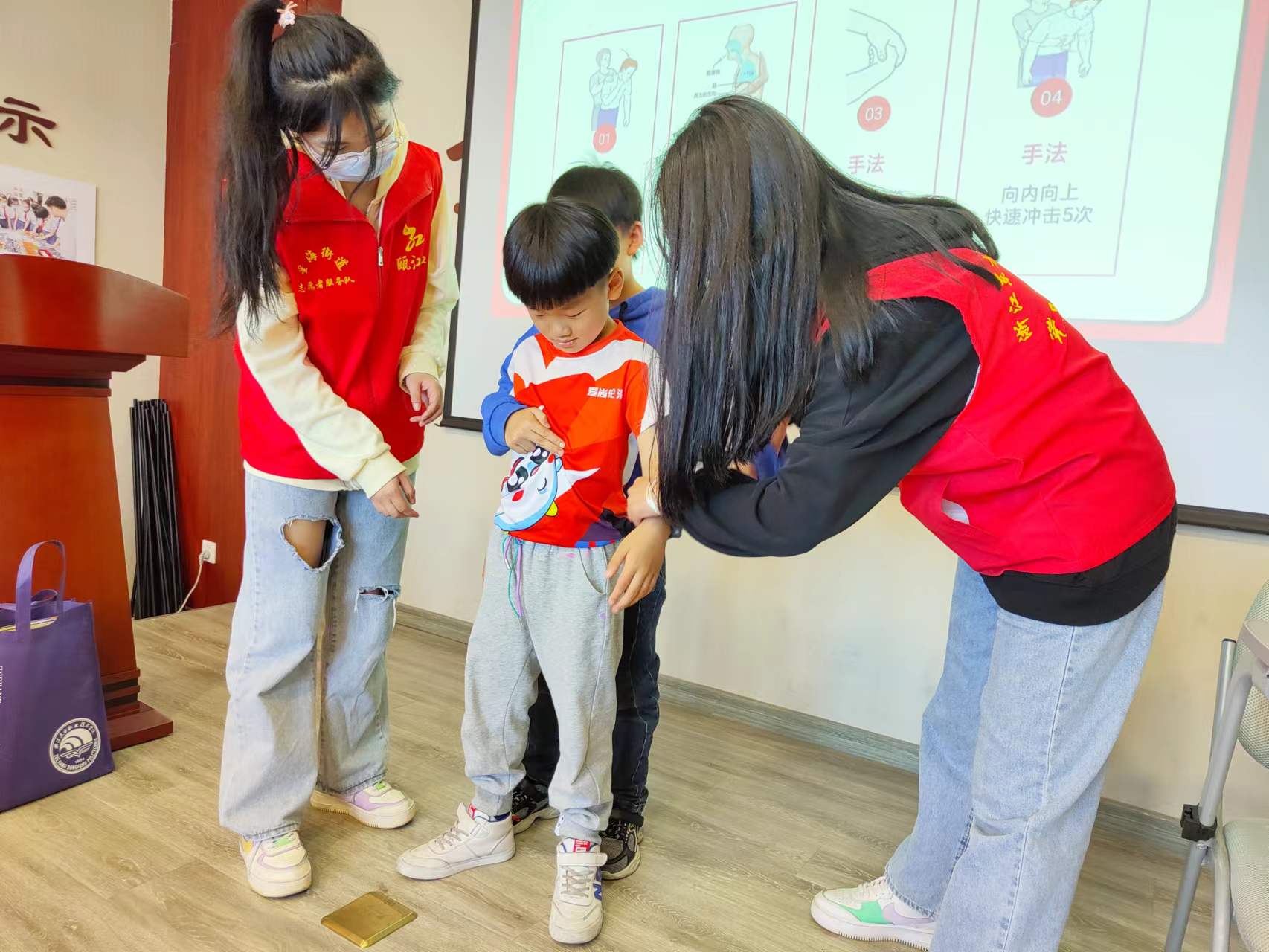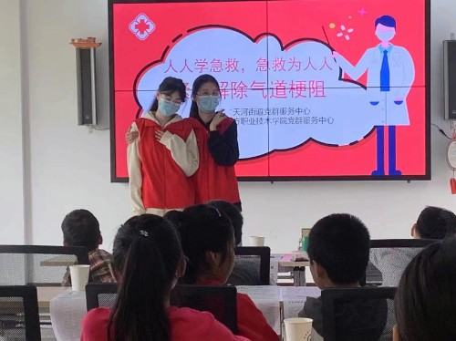 2022年11月12日,护理急救与保健社在“瓯江红”浙南党群服务中心和“瓯江红”天河街道党群服务中心,开展了紧急解除气道梗阻的宣教——海姆立克腹部冲击法的教学活动,目的是拉高安全保障防线,使得低年龄段儿童能够了解医学基础知识、防范未知风险。