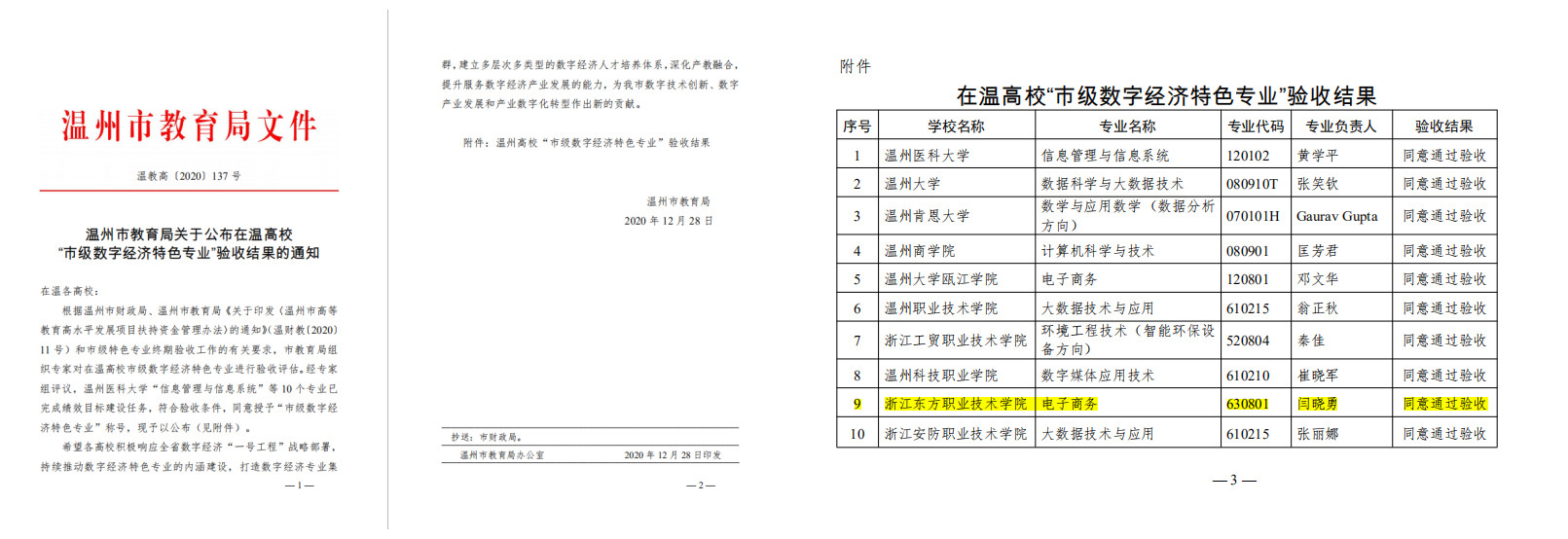 此外,温州市教育局发布温教高〔2020〕137号文件《关于公布在温高校“市级数字经济特色专业”验收结果的通知》,我院电子商务专业已完成绩效目标建设任务,符合验收条件,被授予“市级数字经济特色专业”称号。