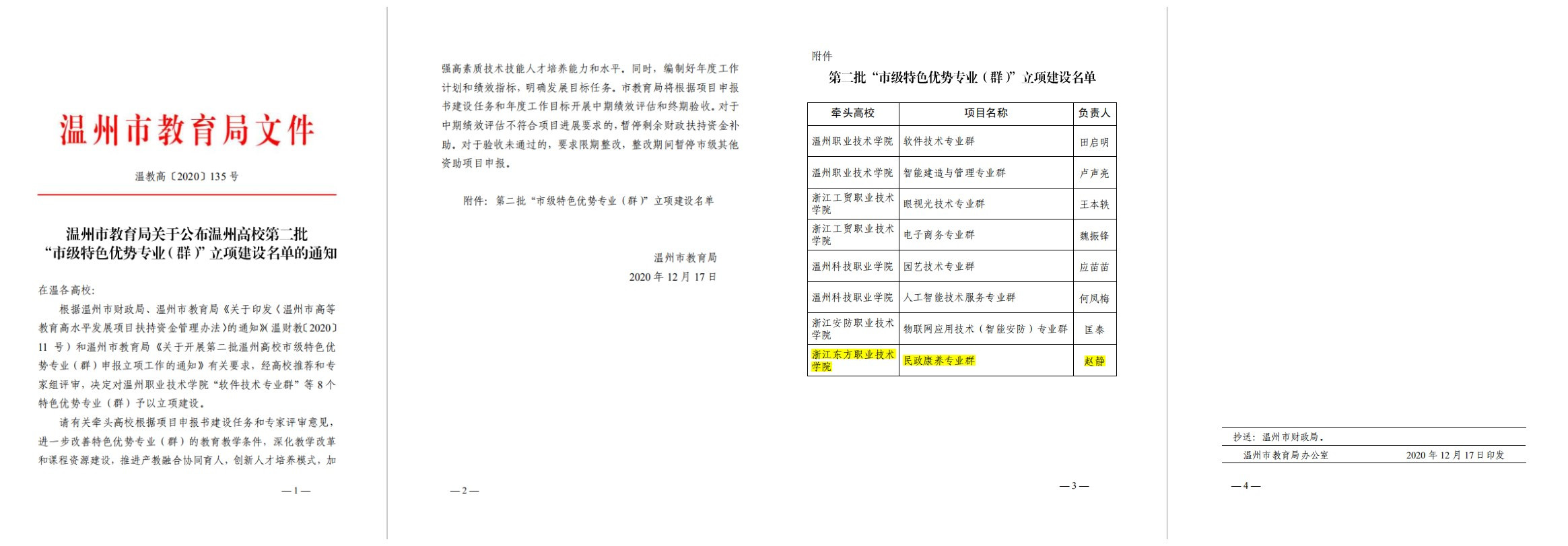 近日,温州市教育局发布温教高函〔2020〕135 号文件《关于公布温州高校第二批“市级特色优势专业(群)”立项建设名单的通知》,我院民政康养专业群获得温州高校第二批“市级特色优势专业(群)”立项。