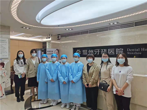 第二站,一行人来到了位于温州市区五马街道的温州牙科医院,看望在这里实习的老年(3+2)19级学生,医院负责人跟我们介绍医院发展历程还有实习生的薪资待遇,以及6名实习生在本单位实习情况和表现,校企合作等方面,实习医院高度认可和表扬了这几位实习生综合和专业精神,他们认为我校学生学习认真,责任心强,能够在短时间内独立担任各岗位主要工作任务,能够遵守行业规章制度,希望在今后可以发展校企合作单位,推动校企合作发展。