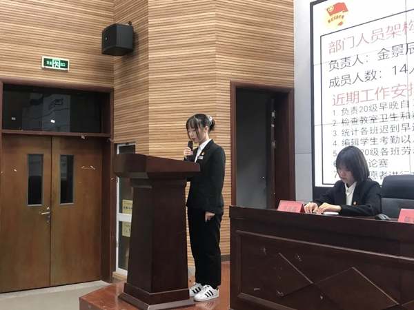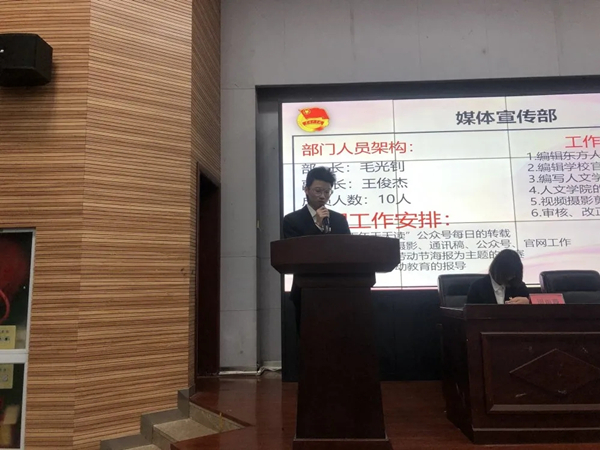 会议在庄严的团歌声中拉开帷幕。会议伊始,由人文学院团委负责人陈春雷老师致开幕词。他回顾了这届学生会自组建以来的工作历程和收获,勉励同学们戒骄戒躁,严格要求自己,树立好服务意识。同时,他提到要充分重视学风建设的重要性,积极引导各班紧抓落实。接着,各部门负责人依次上台发言,讲述了各个部门主要工作职责和近期的工作安排。