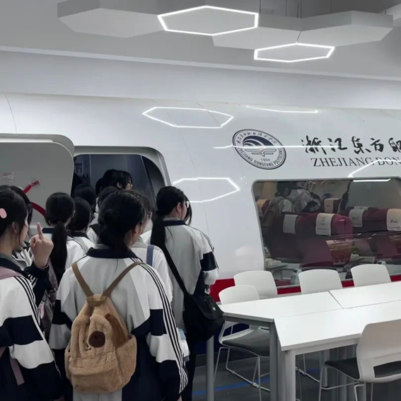 在人文(智慧康养)学院的实训基地,同学们参观了空中乘务、酒店管理实训中心,了解了以酒店、空乘为代表的现代服务业的用人要求与实践能力培养模式。