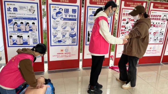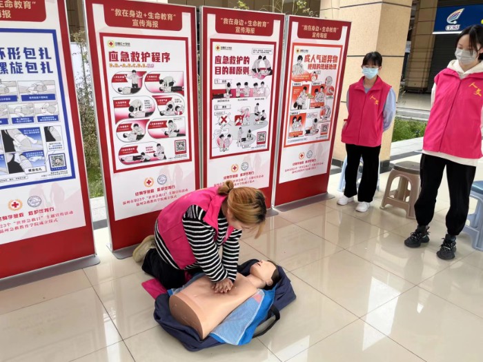 为了普及急救知识,增强学生的自我救助能力,使学生能够掌握基础的急救知识和基本技能,从而在面对紧急情况时能够更好地应对,4月24日人文(智慧康养)学院在东方学院食堂商贸区开展急救日宣传活动。