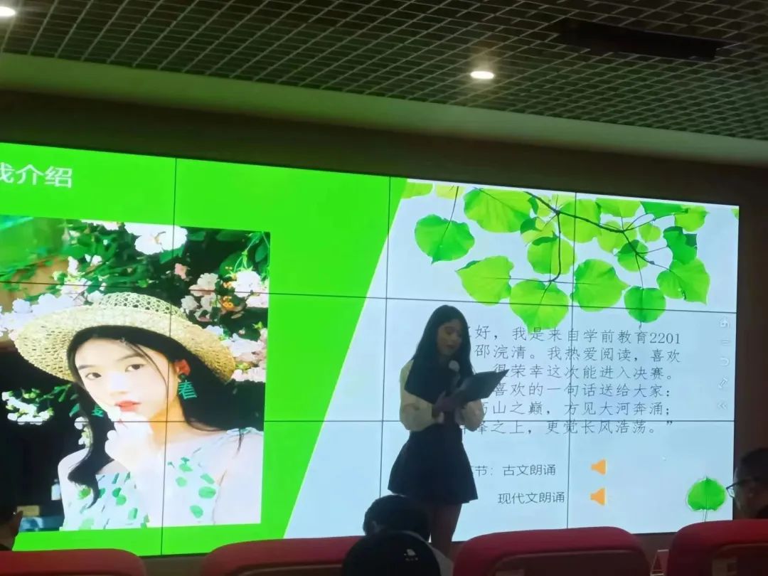 本次比赛分为两部分,首先选手们给大家带来的是朗诵和讲解,限时六分钟。选手们或抑扬顿挫,或豪迈奔放,或温婉多情,或铿锵有力诵读着,他们丰富多彩的感情传承着经典诗歌中不变的永恒,举手投足间展现了他们朝气蓬勃的精神风貌和扎实稳重的语言功底,激起场内一阵阵热烈的掌声。