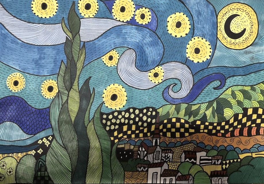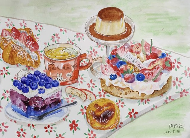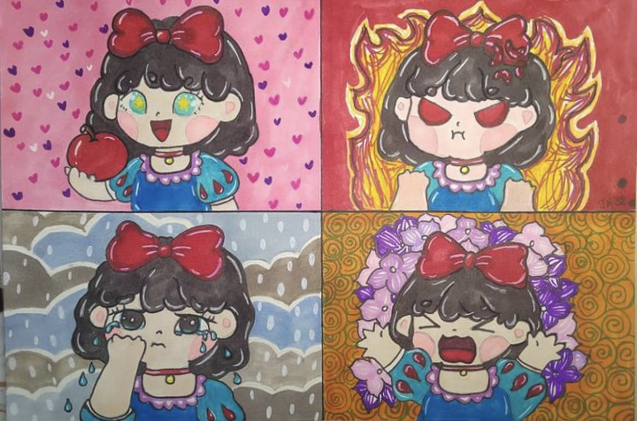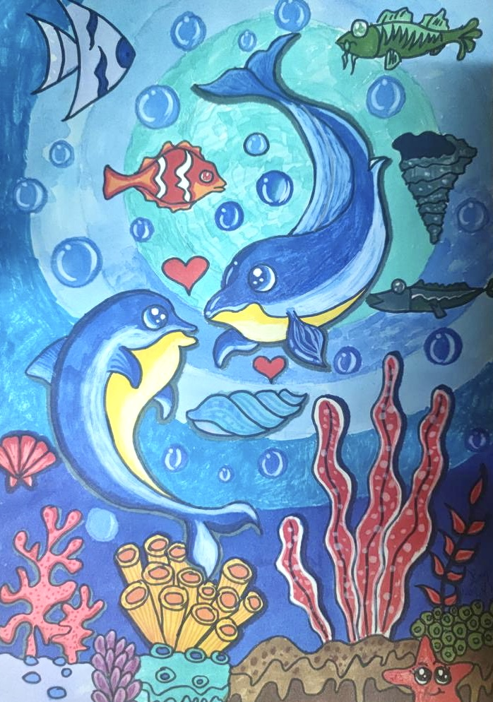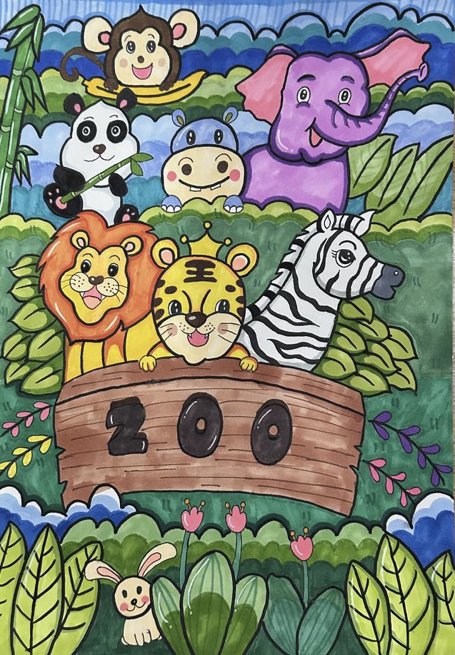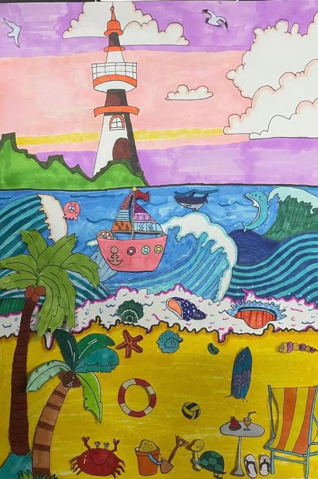 此次画展汇集了近六十副作品,有静物写真、点彩风景画、卡通画等不同技巧的展示,也有海底世界、海边沙滩、动物园等充满想象力的作品,形象各异,姿态万千。翟翌老师点评说,同学们表现得都特别好,不但努力练习,磨练技艺,而且能有自己的想法。