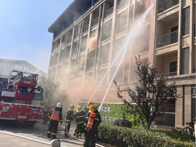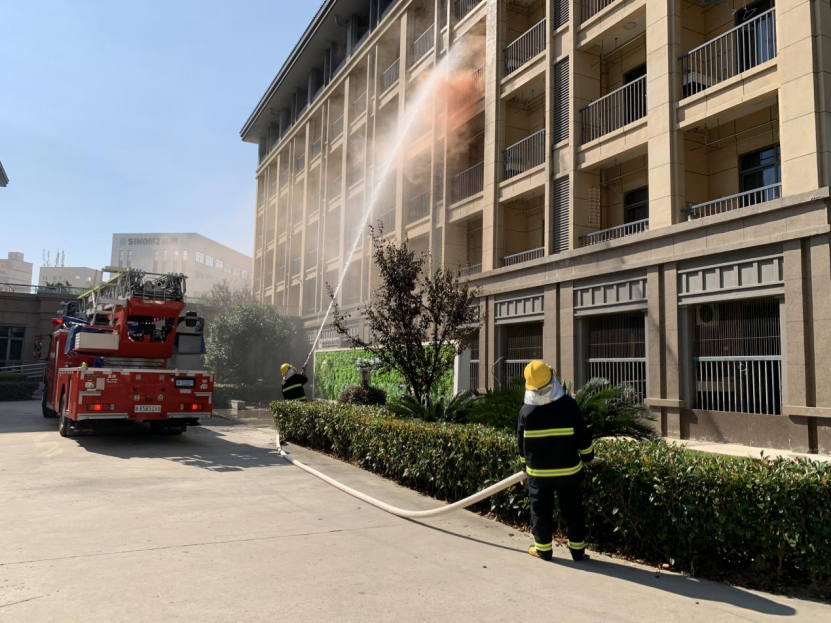 与此同时,消防救援车也第一时间赶往火灾发生地,救援人员到位后以最快的速度拿出消防水枪准备救援。在演习现场消防员模拟实施了被困人员救援与火灾现场灭火的紧急救援全过程。