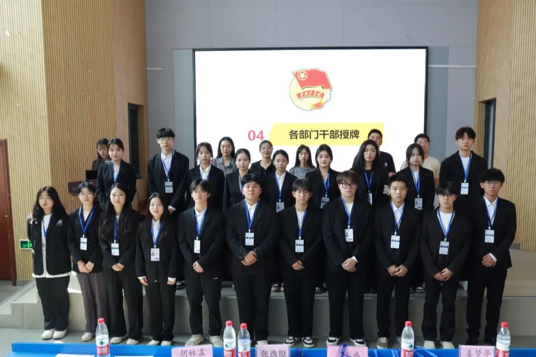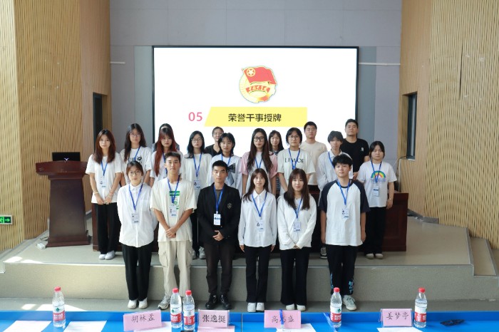 周宁宁老师宣读智慧康养学院(健康医学院)第一届团总支学生会干部聘任文件,文件宣读完毕后由各位辅导员老师为第一届团总支学生会干部及各部门荣誉干事进行授牌仪式。
