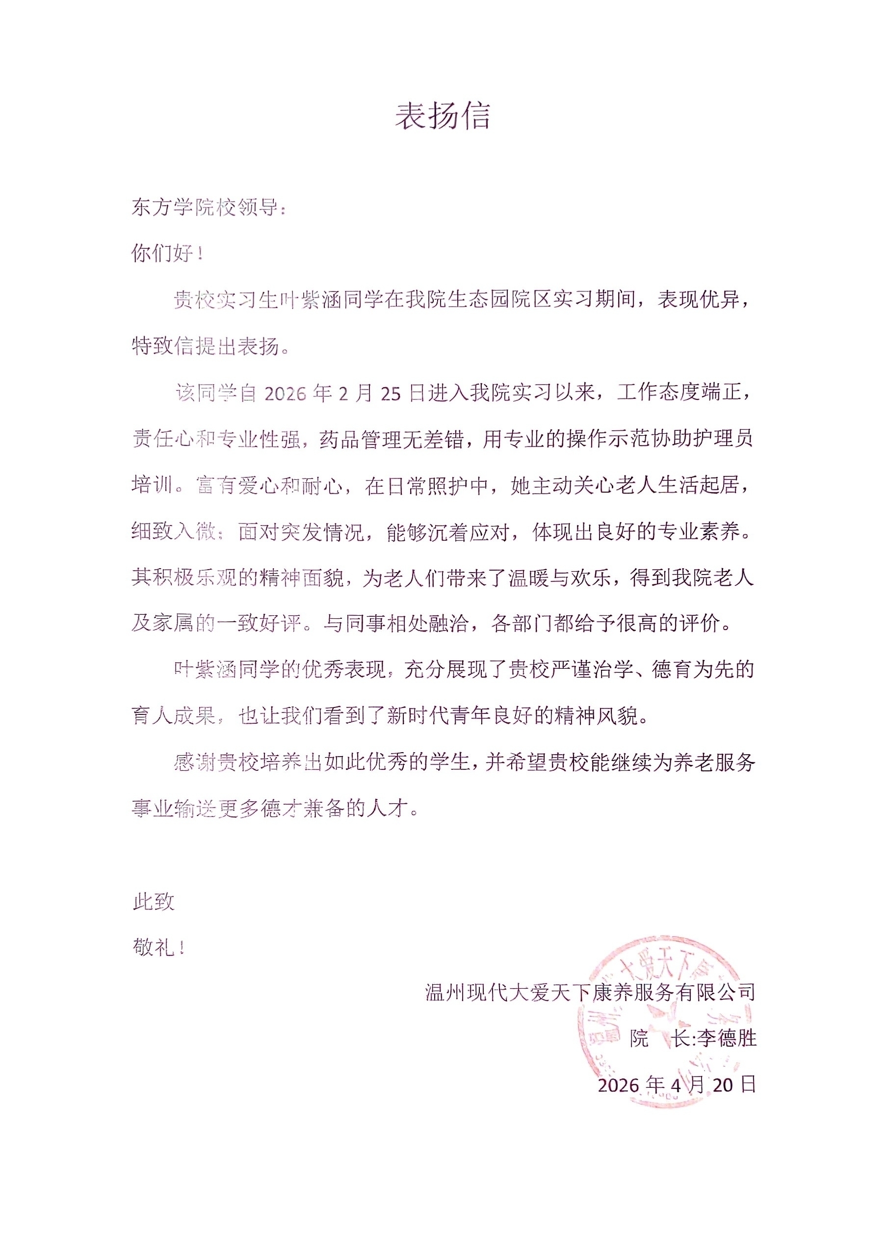 近日,浙江东方职业技术学院智慧康养学院(健康医学院)收到一封来自温州现代大爱天下康养服务有限公司的表扬信。信中对我院智慧健康养老服务与管理专业的叶紫涵同学,在生态园区实习期间的优异表现给予了高度评价与诚挚表扬。